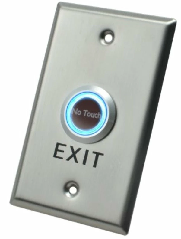 X2 touchless (proximity sensing) exit buttons, elegantly styled with blue / green LED indicator and an adjustable sensor range between 1 and 10cm mounted on a high quality 304 stainless steel panel.